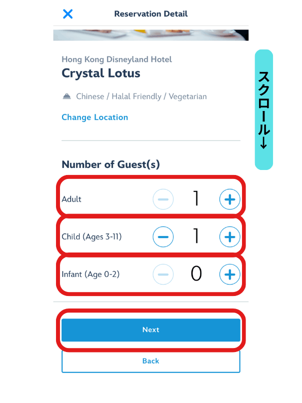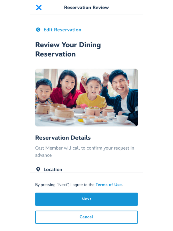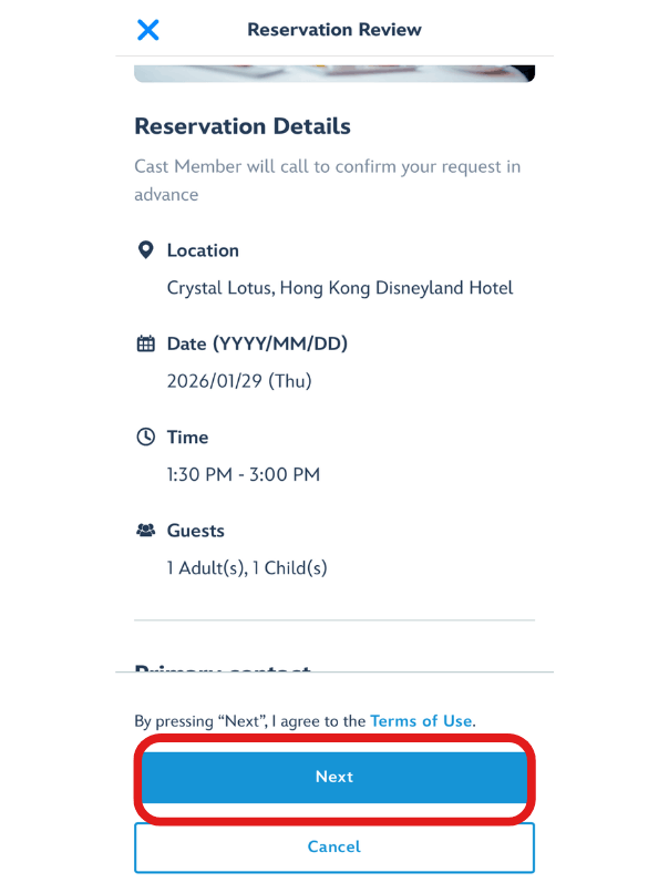 「Review your Dining Reservation」の画面をスクロールすると「予約日時」「人数」が表示される。