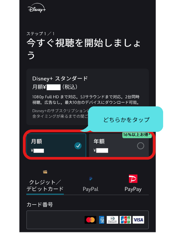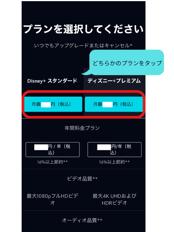 サブスクリプション「Disney +スタンダード(月額プラン)>」をタップ