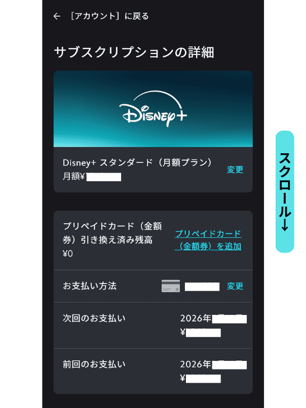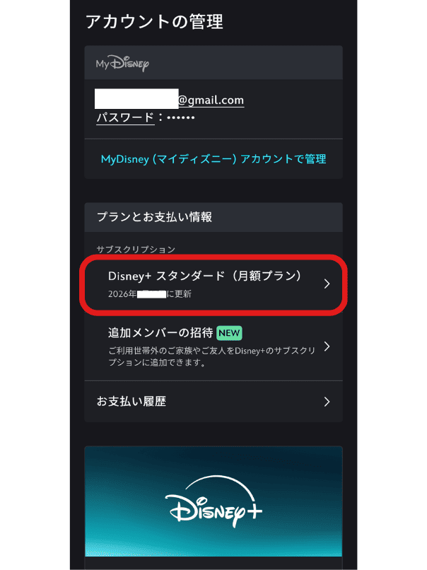 次回請求日は、ディズニープラスにログイン→アカウントの管理→プランとお支払い情報→サブスクリプションをタップで確認できます。