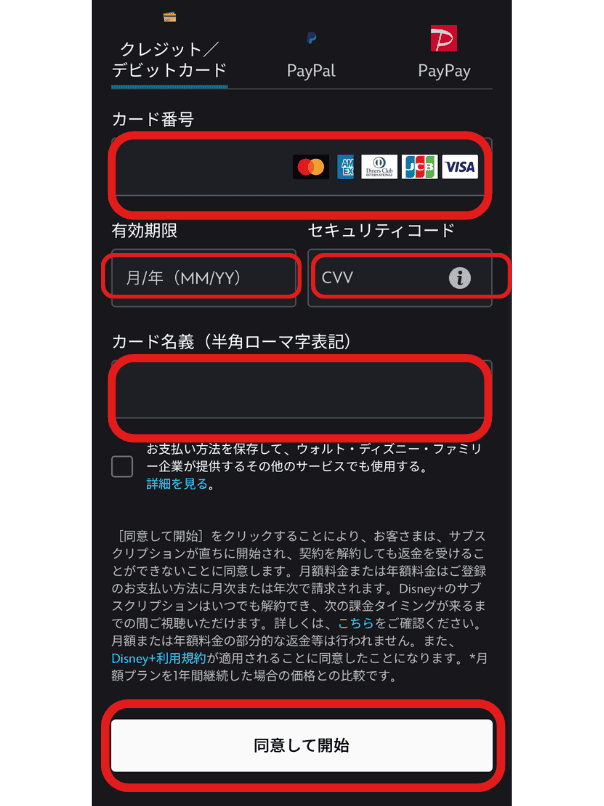 クレジットカード、PayPal、PayPayの中から支払い方法を選び、情報を入力(この画面はクレジットカード)→「同意して開始」をタップ