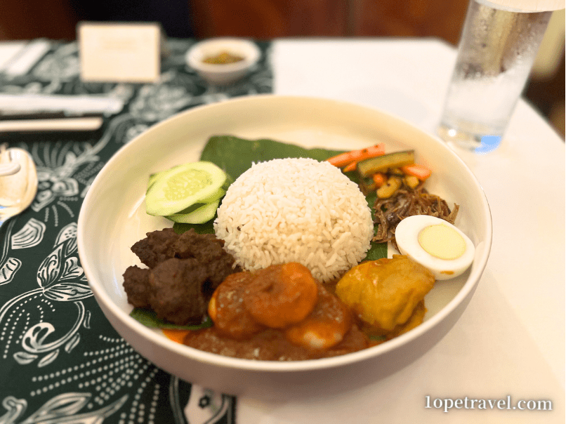 ココナッツミルクで炊いたご飯に揚げた小魚、ピーナッツ、キュウリ、ゆで卵が添えてあり、唐辛子ベースの甘辛いソースを付けて食べる料理